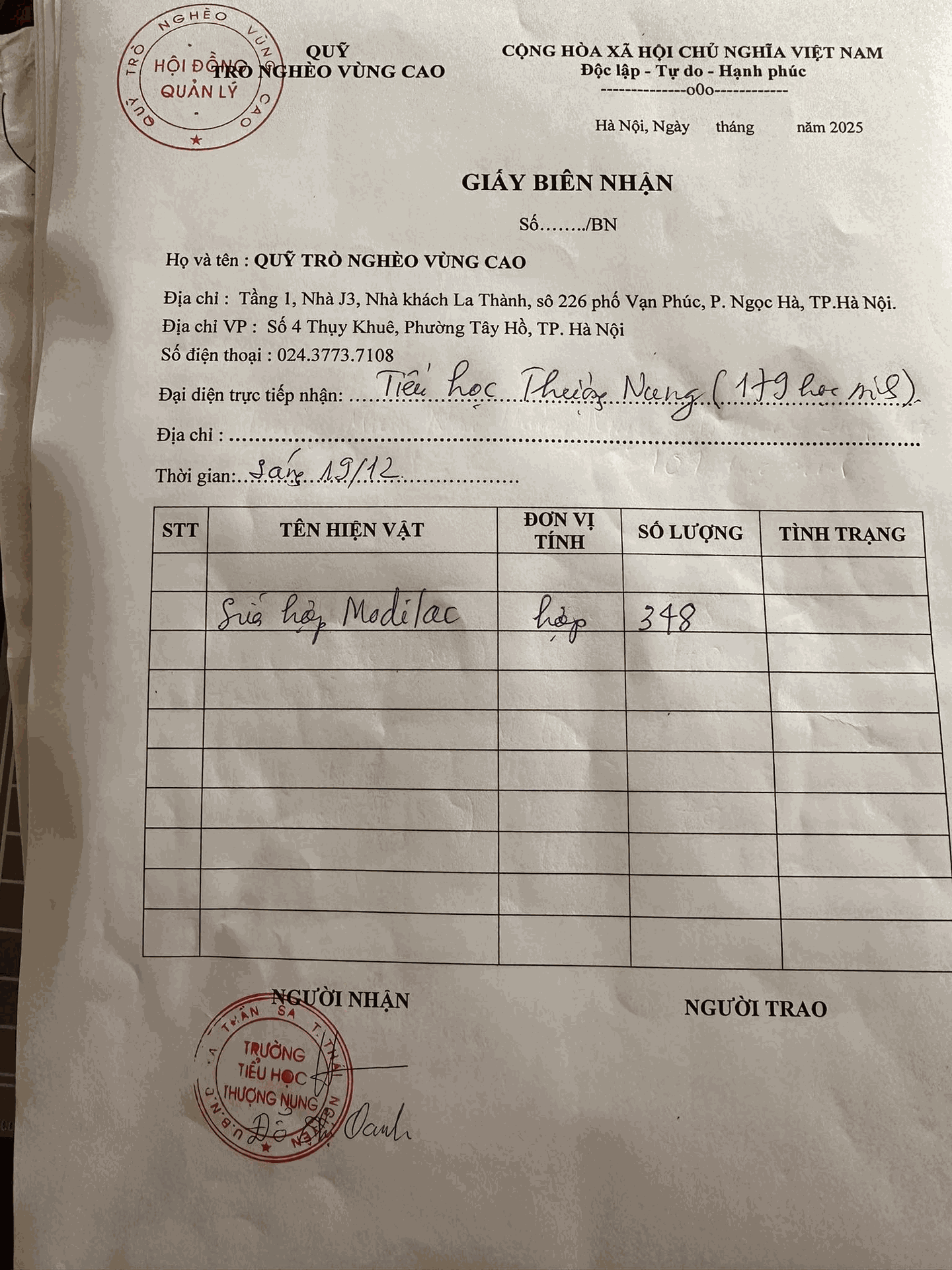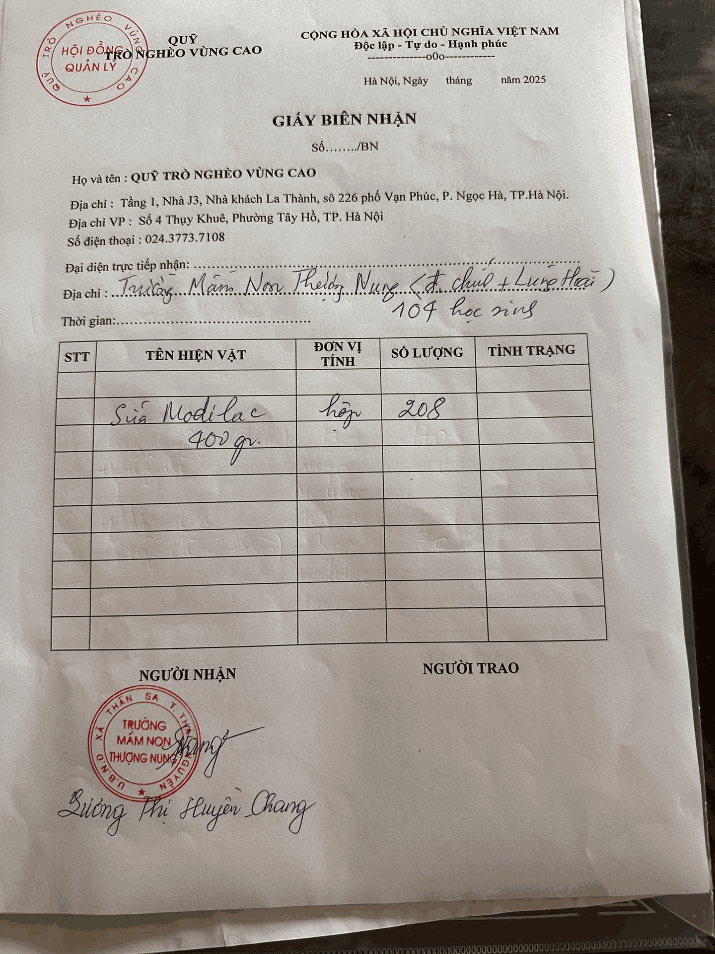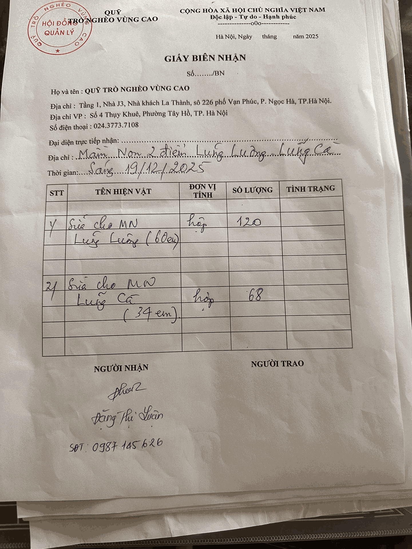 Đây là Giấy Biên nhân Quỹ Trò nghèo vùng cao đã chuyển đợt 1 sữa hộp do Công ty cổ phần Detech Bio ủng hộ đến gần 500 học sinh Thần Sa (Thái Nguyên).
